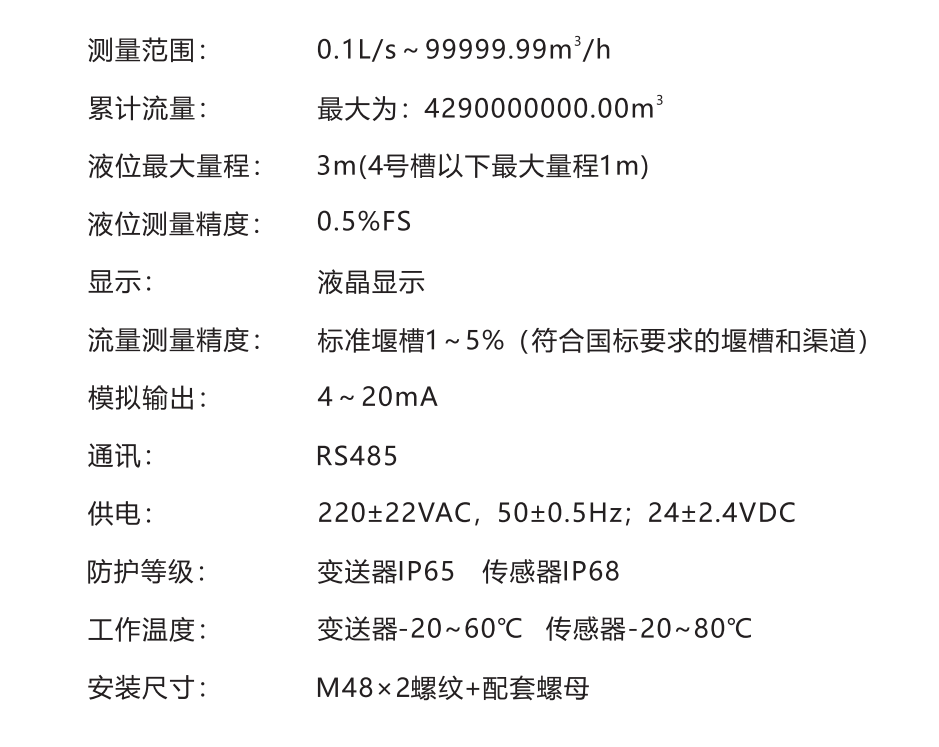產品簡介: 超聲波明渠流量計GFC500的功能特點有:內置多種算法,適合各種標準水堰;堅固穩(wěn)定的超聲波傳感器適用惡劣工業(yè)場合;中文菜單,操作更方便;探頭互換性強,備件更換更方便;盲區(qū)可以人工設置,屏蔽探頭附近的干擾信號;換能器內置溫度傳感器,實時自動溫度補償